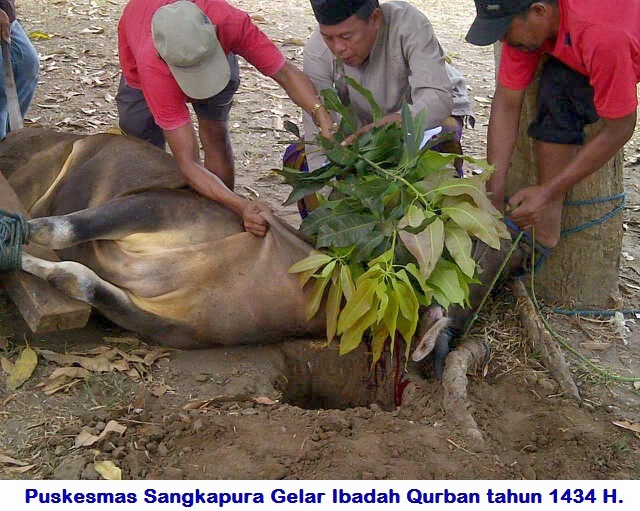 Berkat kekompakan seluruh pegawai Puskesmas Sangkapura menggelar ibadah qurban dengan memotong 5 ekor sapi. Pelaksanaan ibadah qurban dilaksanakan hari rabu (16/10/2013) di Puskesmas Sangkapura yang letaknya di Pesanggrahan Bawean.