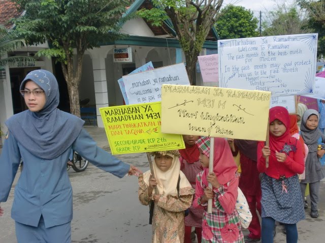 Peserta disepanjang jalan meneriakkan kirab ramadhan, disambut "yes-yes" kata siswa. Kirab yang diikuti oleh Kepala Sekolah dan Dewan Guru, termasuk semua siswa SDN Kotakusuma I membawa tulisan bernuansa pesan seputar ramadhan. (bst)